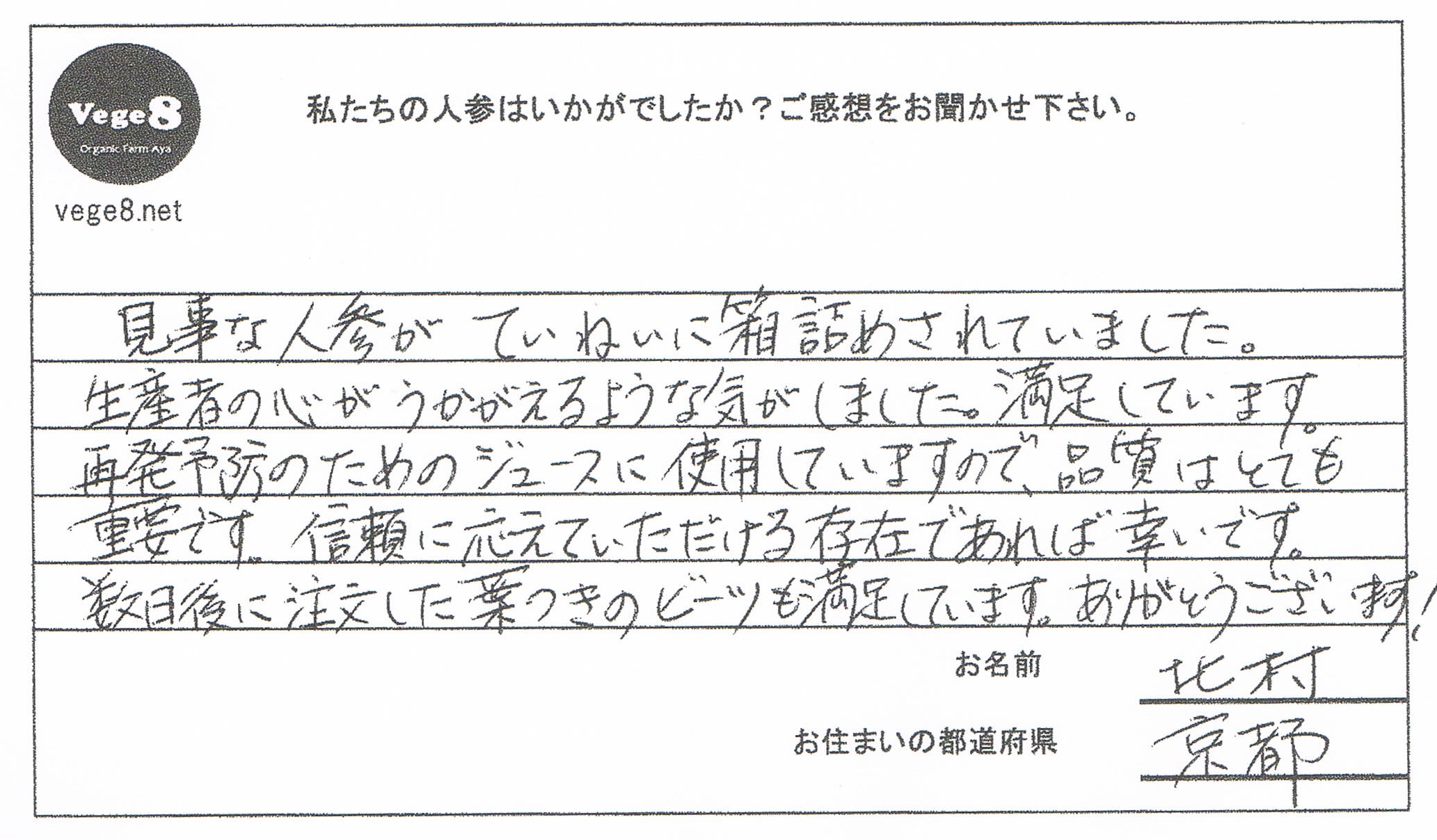 見事な人参がていねいに箱詰めされていました。生産者の心がうかがえるような気がしました。満足しています。