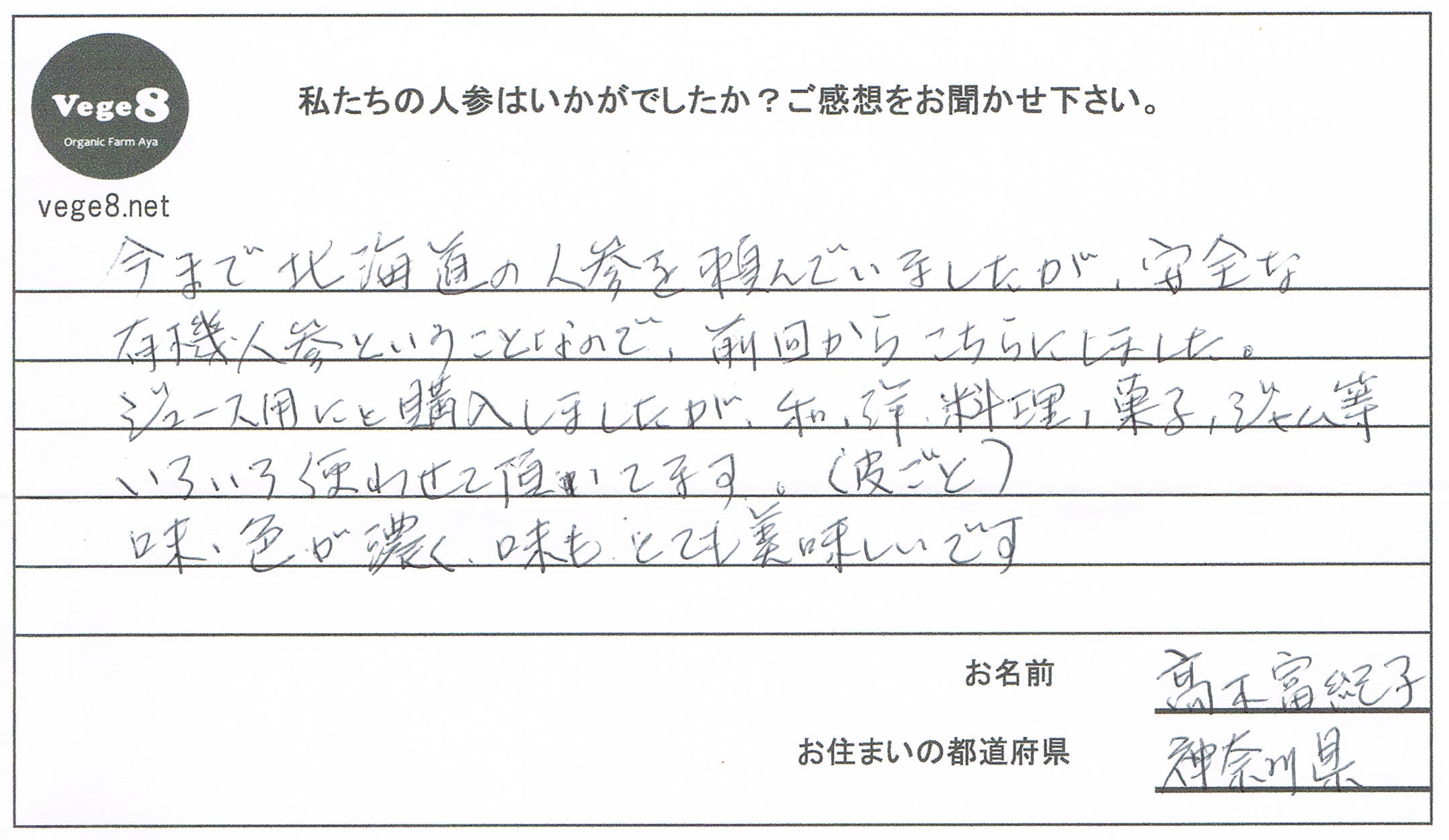 今まで北海道の人参を頼んでいましたが、安全な有機人参ということなので、前回からこちらにしました。ジュース用に購入しましたが和・洋、料理、菓子、ジャム等いろいろ使わせて頂いています(皮ごと)。味・色が濃く、味もとても美味しいです。