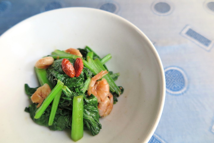 2.鍋に油を温め、海老を炒める。小松菜も加え全体にしんなりしたら、紹興酒と戻し汁を加え一気に炒める。醤油少々を鍋肌から加えて香りをつける。