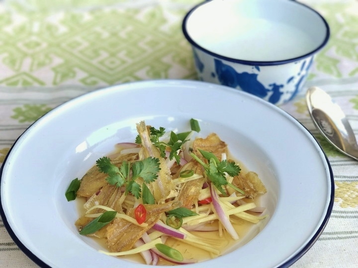 <オーガニックファーム綾>の畑で採れた無農薬有機生姜を使って、”魚のタイ料理”とリクエストさせていただいたところ、暑くなる季節にぴったりの「小魚と有機生姜のヤム」を教えてくださいました。白粥といただきます。