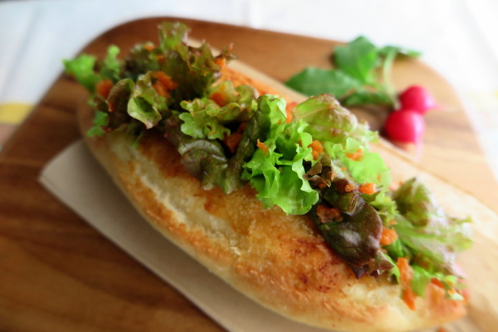 2.レタスを洗ってしっかり水を切り、人参ドレッシングで和えて、バケットにあふれるほど詰める。