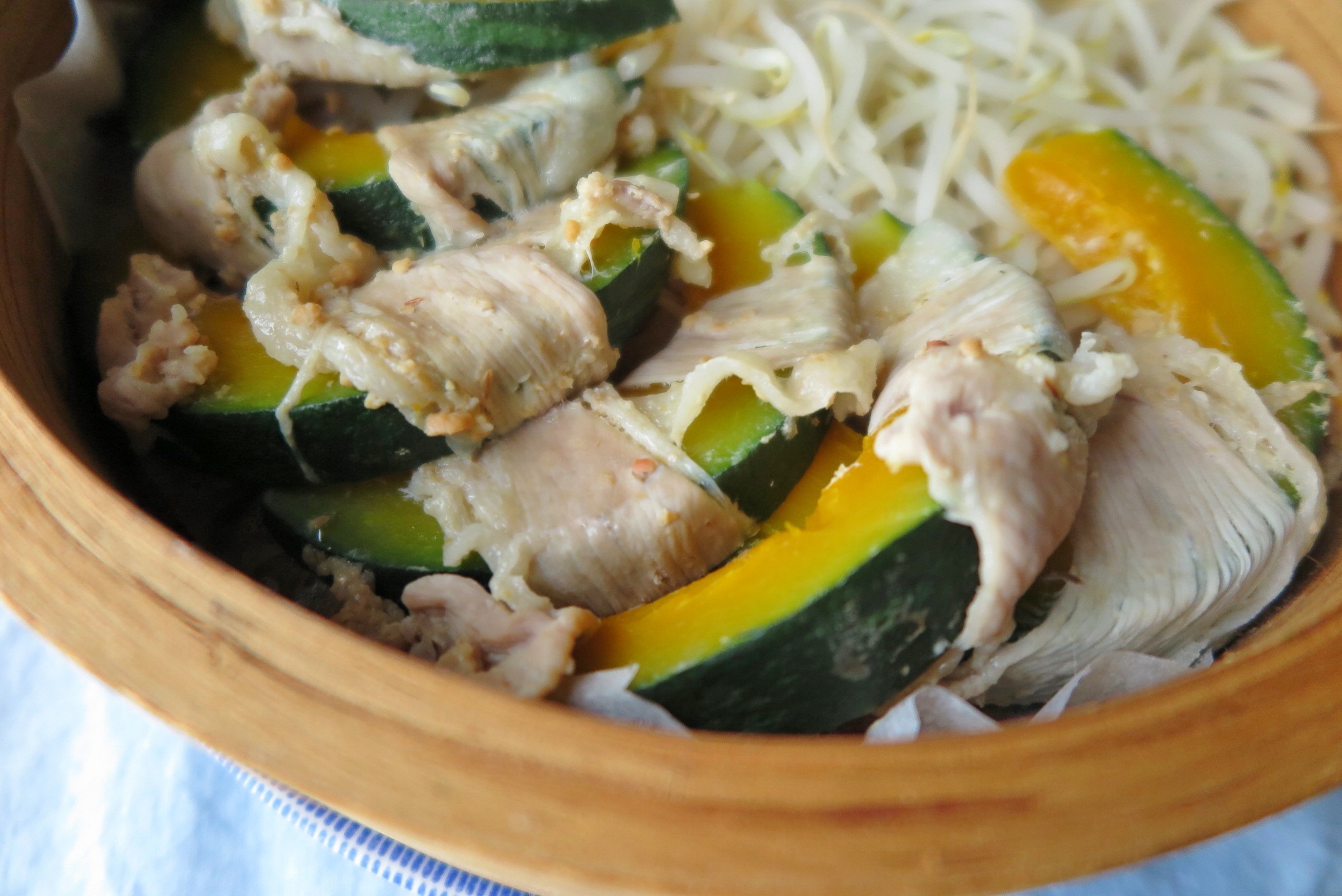 3.かぼちゃは、放射状に薄目に切り、味噌に漬けた豚肉を巻き、もやしと蒸籠に並べる。